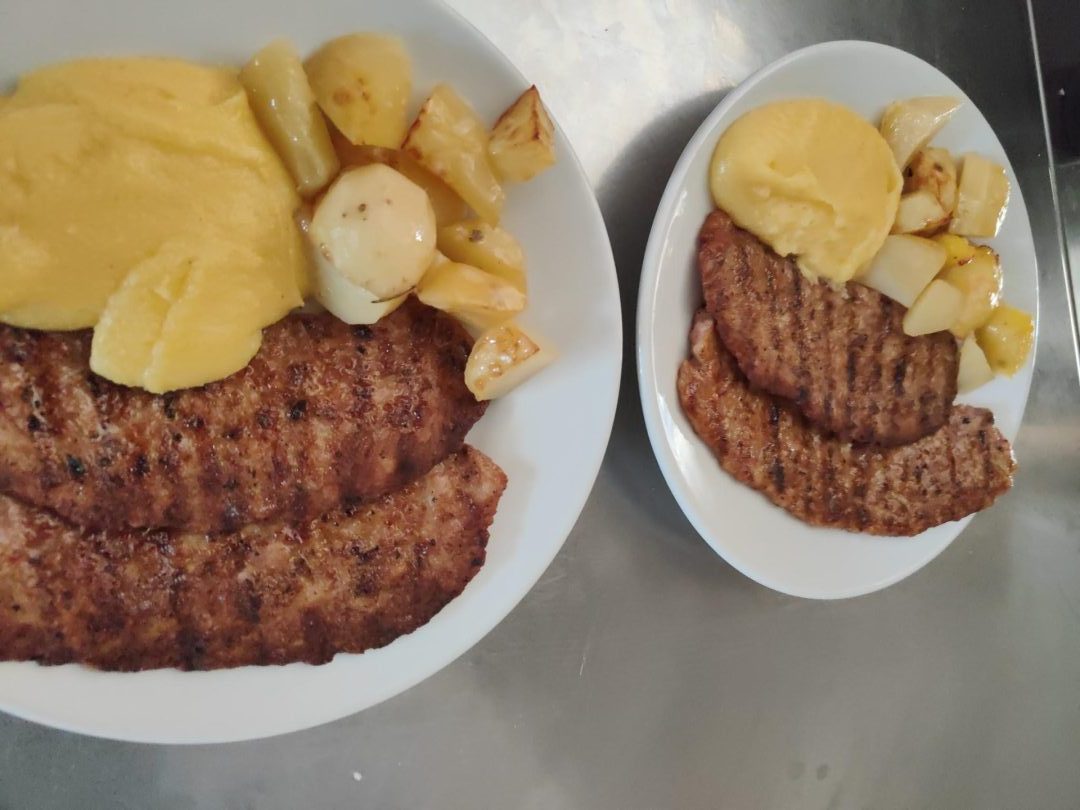 Il piatto parapendio comprende due salsicce schiacciate, polenta e patate al forno.